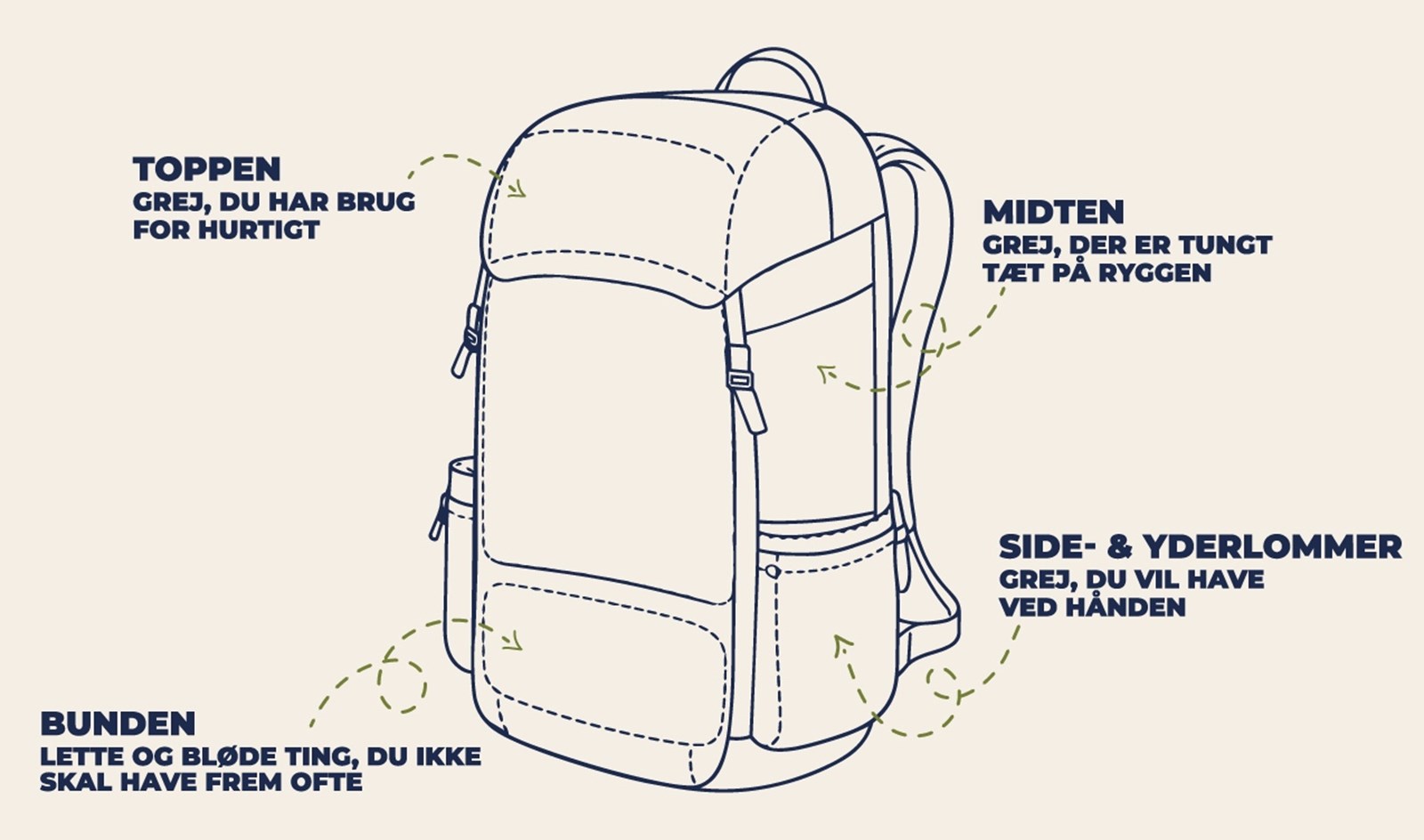 TIP: Pak tøjet i drybags eller poser. Så forbliver det tørt, selv hvis rygsækken får en omgang regn- og det er næsten garanteret, at den gør!